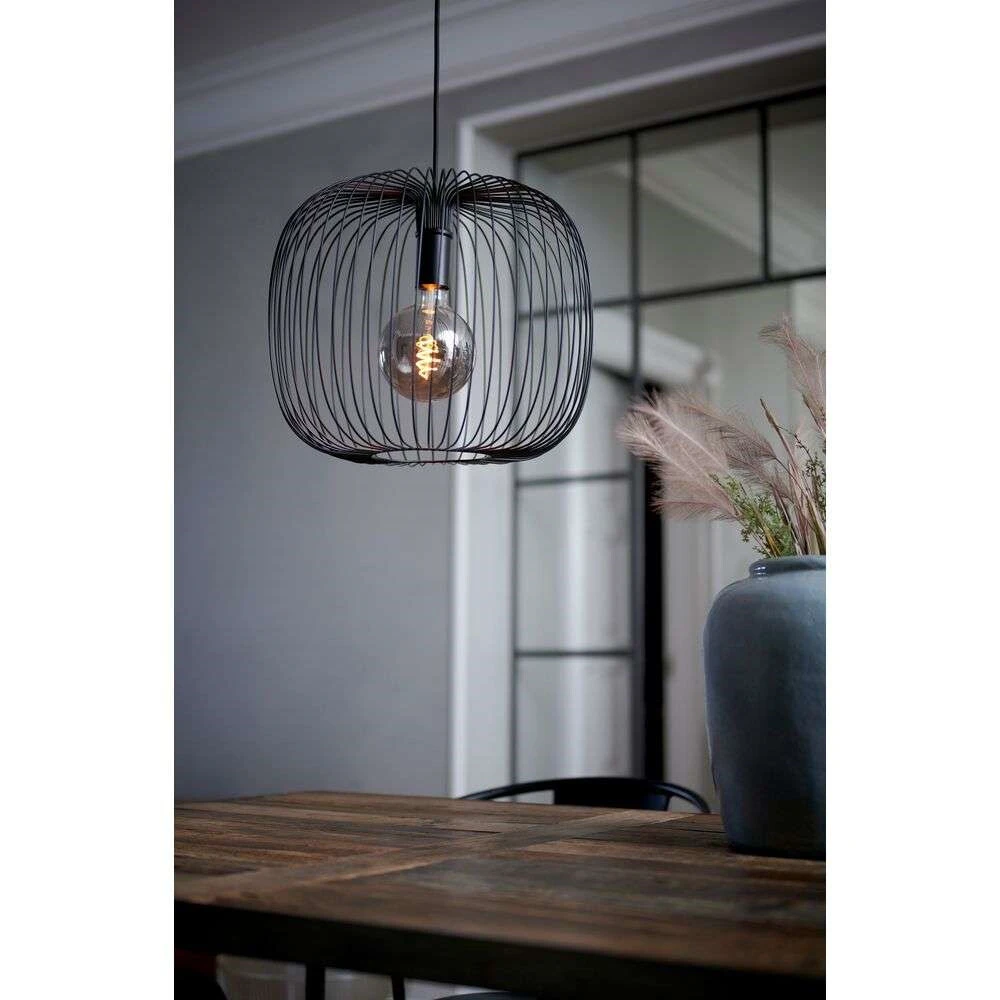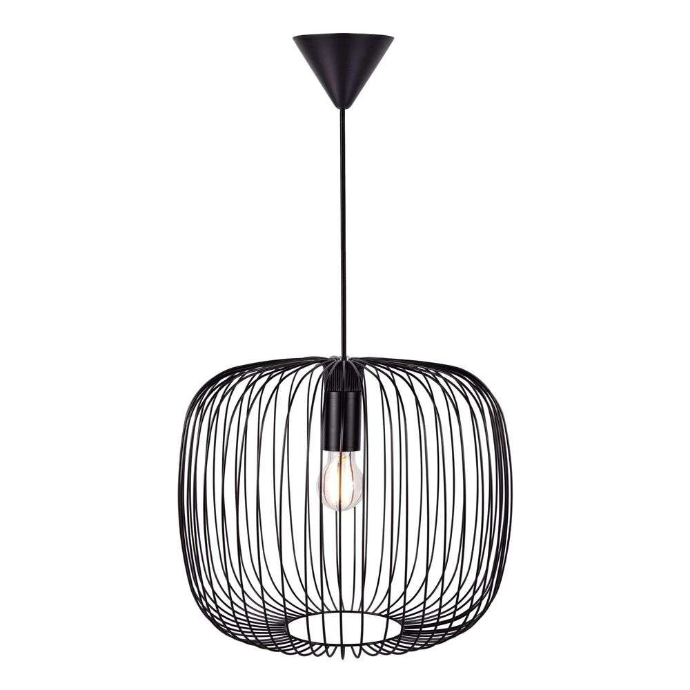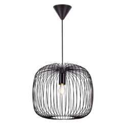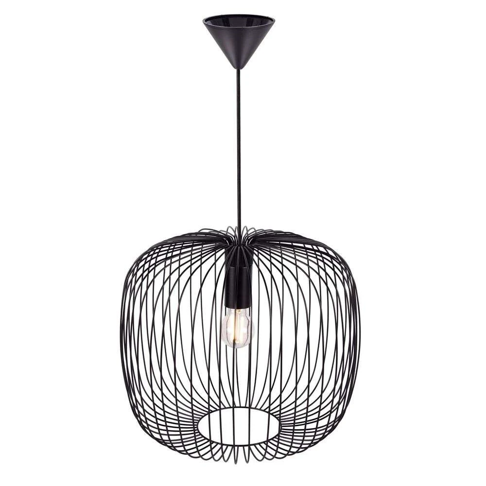 Beroni 40 Pendelleuchte Schwarz ist eine formschöne Leuchte mit einem schlichten Ausdruck und einer klaren Beleuchtung. Der traditionelle Lampenschirm wurde durch einen Retro-Käfigschirm ersetzt – ein Design, das sowohl zu modernen als auch zu Vintage-inspirierten Interieurs passt. Die Stativstruktur des Schirmkäfigs wirft beim Einschalten der Leuchte faszinierende Schattenmuster um die Lampe herum und schirmt die Lichtquelle teilweise vor Blendung ab. Dennoch ist das Leuchtmittel weiterhin sichtbar und sorgt für eine klare und direkte Beleuchtung nach allen Seiten. Der Schirm ist nach unten hin offen, so dass das Licht ungehindert ausströmen kann. Deshalb ist die Pendelleuchte ideal für die Montage über Esstischen und anderen Flächen.