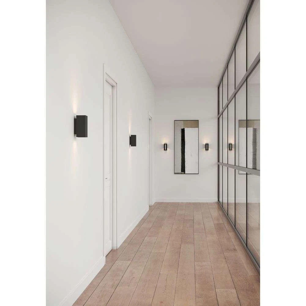 Im Inneren des rechteckigen Leuchtenkopfes befindet sich eine eingebaute LED-Lichtquelle, die ein effizientes Licht abgibt, das durch eine Öffnung an beiden Enden der Leuchte austritt. So entsteht ein wunderschönes zweiteiliges Licht, das in einem weichen, indirekten Schein die Wand hinauf und hinunter strahlt. Die strategische Positionierung der Lichtquelle sorgt dafür, dass das Licht nicht blendet und ein praktisches und angenehmes Licht erzeugt.