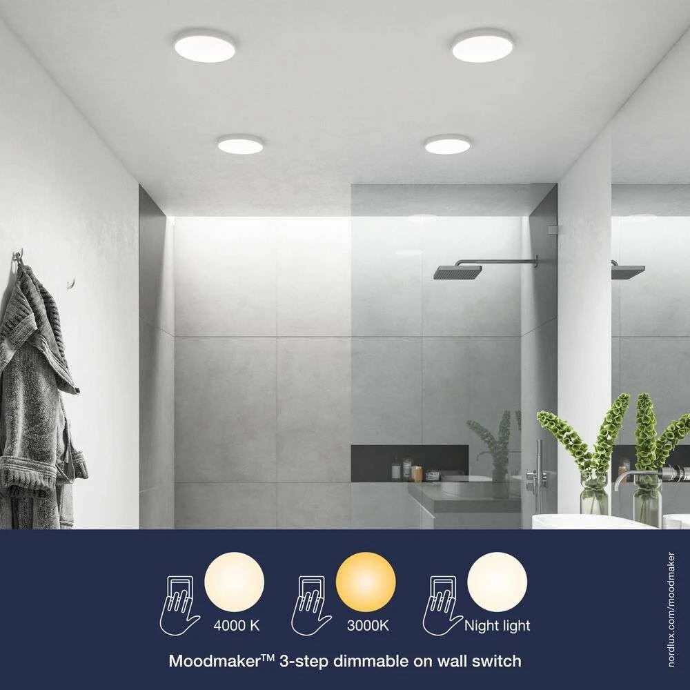 Die Leuchte ist nicht auf einen bestimmten Raumtyp beschränkt, sondern kann überall angebracht werden, auch in Badezimmern, Toiletten und anderen Feuchträumen, da die Leuchte IP-geschützt ist. Dank der eingebauten Moodmaker-Funktion kann das Licht über den Standard-Wandschalter in drei verschiedenen Stufen eingestellt werden, so dass Sie immer die richtige Beleuchtung für alle Zeiten und Zwecke haben.