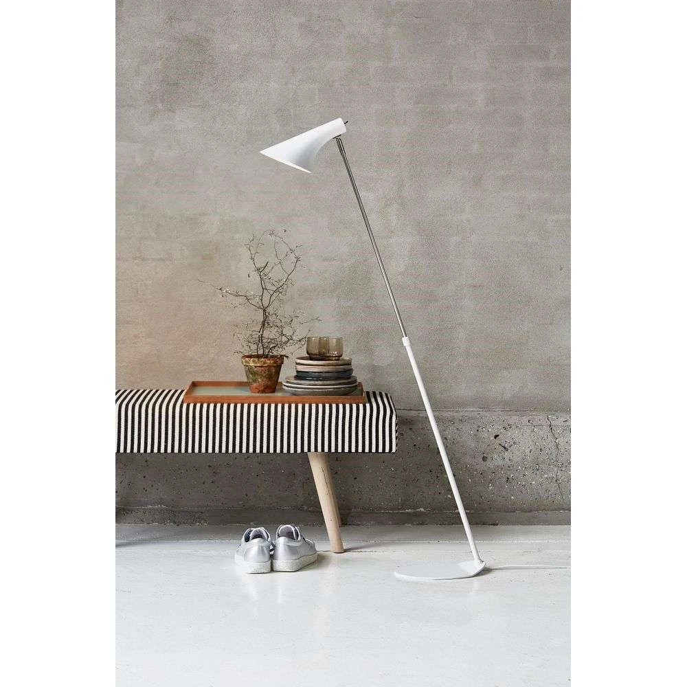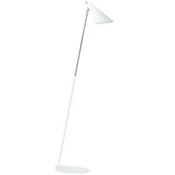 Vanila Stehleuchte Weiß präsentiert sich in einem modernen Design, das schlicht und charaktervoll zugleich ist. Die Leuchte zeichnet sich durch eine neutrale, monochrome Farbgebung und eine asymmetrische Form mit schrägen Linien aus, was sie zu einem echten Statement Piece in der modernen Wohnung macht. Gleichzeitig ermöglicht das asymmetrische Design einen besonders breiten Lichteinfall. Die Innenseite des Schirms ist in Weiß gehalten, wodurch das Licht effektiv reflektiert wird und noch heller erscheint. Das Licht ist direkt und nach unten gerichtet, was Vanila als Leselampe geeignet macht. Hier ist es ein klarer Vorteil, dass der Leuchtenkopf gedreht werden kann, um die Lichtrichtung einzustellen.
