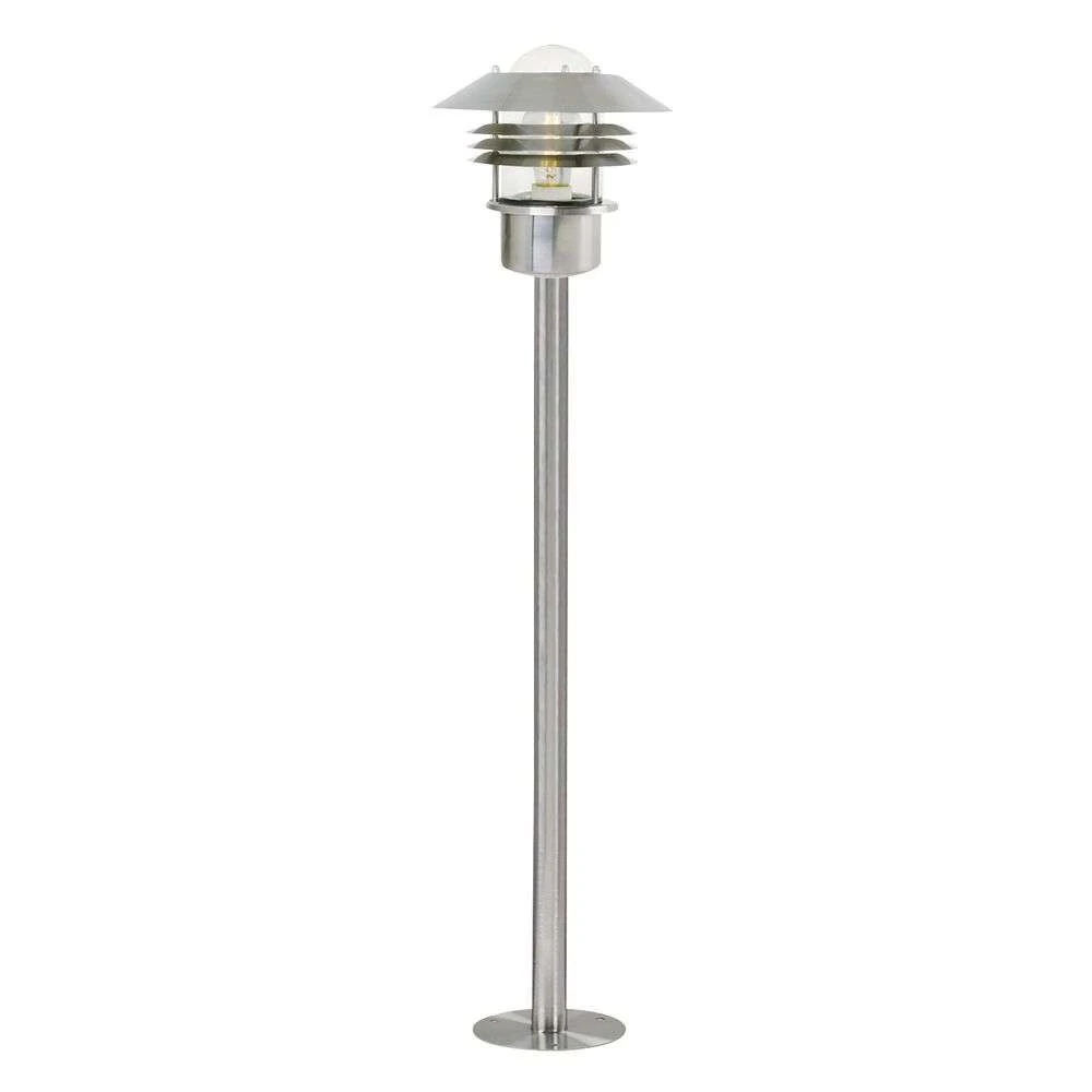 Vejers Garten Leuchte Edelstahl ist ein klassisches Außenleuchten-Modell mit einem besonderen Ausdruck, der nostalgisch und zeitlos zugleich ist. Das Design zeichnet sich durch einen mehrschichtigen Schirm aus, der eine klare Glaskuppel umgibt, in der sich die Lichtquelle befindet. Die transparente Kuppel lässt das Licht von allen Seiten ungehindert eindringen, während die Schirme die Blendung verhindern und das Licht sanft nach unten für ein praktisches Orientierungslicht lenken.