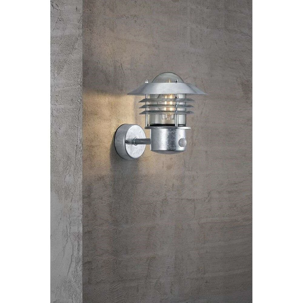 Vejers Wall Light w/Sensor Galvanised ist ein klassisches Modell für den Außenbereich mit einem besonderen Ausdruck, der nostalgisch und zeitlos zugleich ist. Das Design zeichnet sich durch einen mehrschichtigen Schirm aus, der eine klare Glaskuppel umgibt, in der sich die Lichtquelle befindet. Die transparente Kuppel lässt das Licht von allen Seiten ungehindert eindringen, während die Schirme die Blendung verhindern und das Licht sanft nach unten für ein praktisches Orientierungslicht lenken.